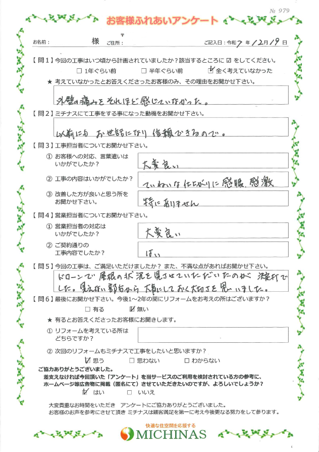 何社か候補はありましたが、親身に相談にのって頂いたのでミチナスさんに決めました。最初、社長さんは怖そうでしたが話をすると印象が変わりとても丁寧に親身にリフォームの相談にのってもらえました。